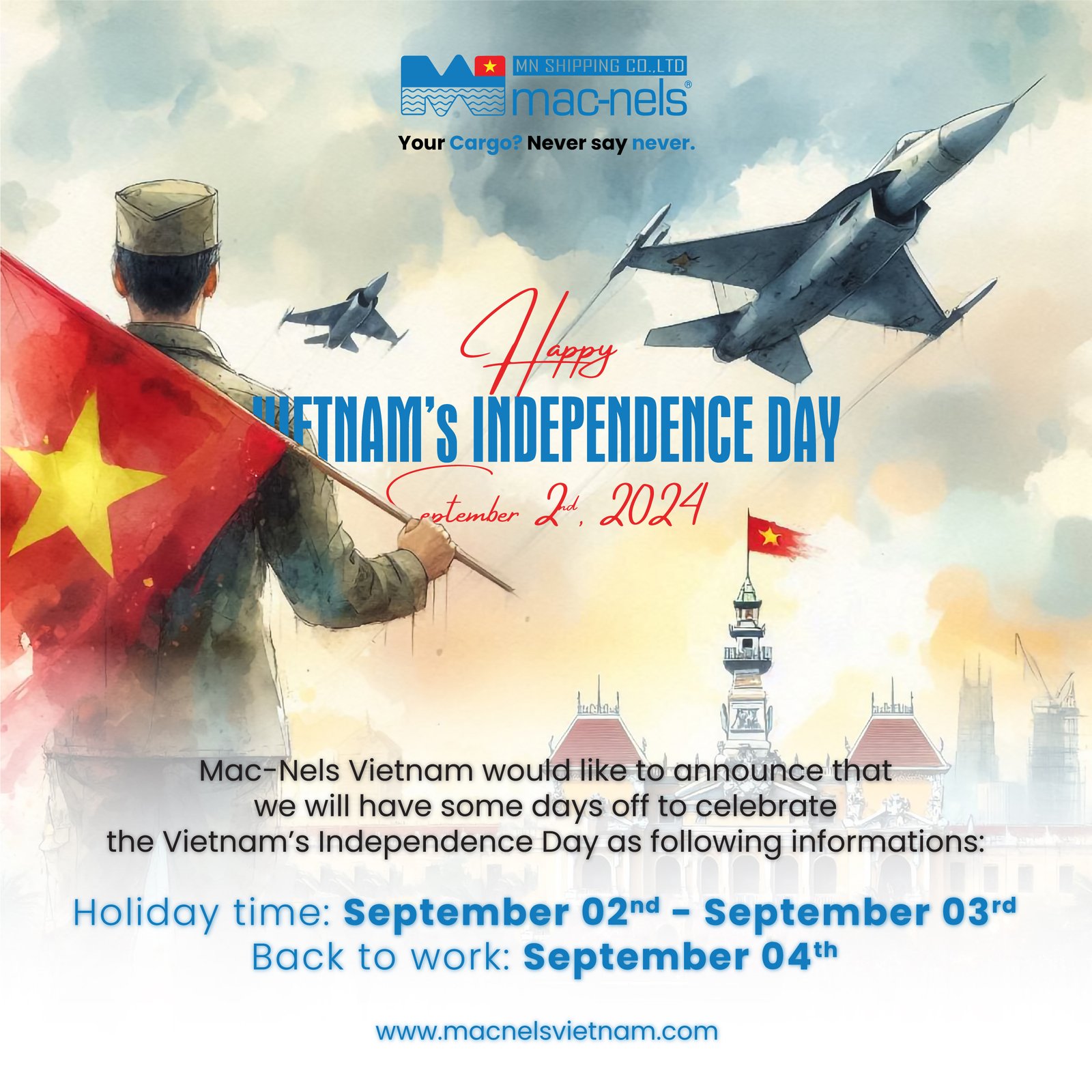 Macnels News - Mac-Nels - Your Cargo? Never say never. Mac-Nels You Known. The News You Need Holiday Notice – Vietnam’s Independence Day Please be informed that our offices will be closed from 𝐌𝐨𝐧𝐝𝐚𝐲, 𝐒𝐞𝐩𝐭𝐞𝐦𝐛𝐞𝐫 𝟐𝐧𝐝, 𝟐𝟎𝟐𝟒 to 𝐓𝐮𝐞𝐬𝐝𝐚𝐲, 𝐒𝐞𝐩𝐭𝐞𝐦𝐛𝐞𝐫 𝟑𝐫𝐝, 𝟐𝟎𝟐𝟒, in Read More » October 18, 2024
